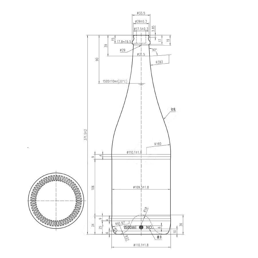 - Es besteht aus Kalk-Natron-Glas, erfüllt internationale Lebensmittelsicherheitsstandards und gewährleistet die Stabilität des Champagners bei langfristiger Lagerung.